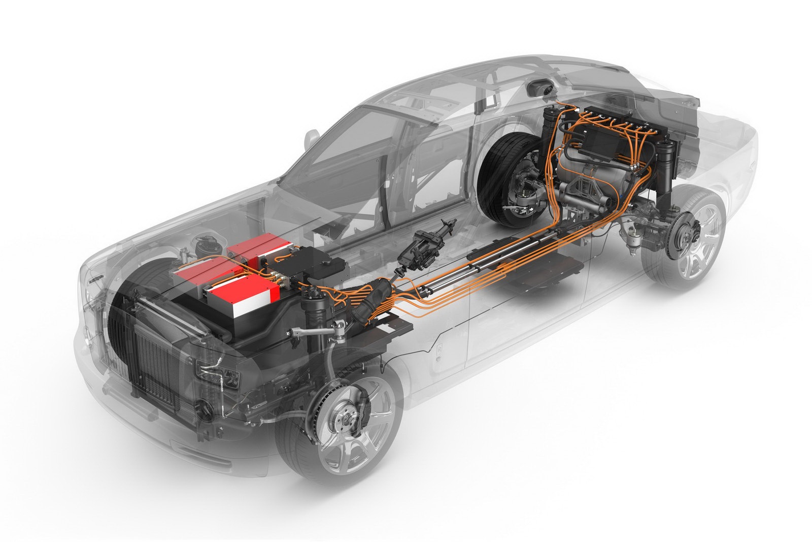 Rolls-Royce has pulled the wraps off the next vehicle in its EX concept series, the 102EX (AKA Phantom Experimental Electric).The 102EX is meant to gauge reactions and opinions from the firm's clientele, shareholders, and the general public in regards to a Roller with a non-traditional drive train. As the 102EX is strictly a concept, Rolls-Royce hopes to resolve any issues that people might have with an all-electric - or any non-traditionally powered - Rolls. Going back to the RR playbook, customers are the most important people to the Spirit of Ecstasy. Therefore, the manufacturer wants to be sure that expectations are met, not too much extra effort has to be put into ownership ("acceptable range...without frequent recharging"), and a proper Rolls-Royce ownership experience is provided. Using the Phantom's aluminum spaceframe as a base, Rolls-Royce engineers have installed two electric motors (145 kW each) and a lithium-battery pack in the 102EX. The pack uses five lithium-cobalt-manganese-oxide (or NCM) "pouch cells" sized at four, eight, ten, thirty-six, and thirty-eight cells in a formation that mimics the shape of the usual engine and transmission. Charging is performed by three individual 3kW chargers that allow for both single-phase and three-phase charging at 20 hours and 8 hours, respectively. Rolls is also trying out induction charging, which uses a giant transfer pad on the floor and an induction pad under the car (like those Powermat phone chargers). All told, the electric setup provides the 102EX with 290 kW (389HP) and 800 Nm of torque (versus 338 kW or 453HP and 750 Nm in the standard Phantom). Current estimates put the 102EX's range at 200 kilometers (124 miles) with the ability to reach 60 mph (96 km/h) in under 8 seconds (5.7 seconds for the V12 Phantom) and a limited top speed of 99 mph (160 km/h). Trying not to sway too far from expectations, the 102EX will retain many standard Roll-Royce features while applying new ideas that represent the car's electric heart. Its exterior is finished in four coats of Atlantic Chrome, a shade of paint that uses ceramic nano particles to provide a unique reflective surface. Also, the nose-mounted Spirit of Ecstasy is now made of Makrolon (not stainless steel) and will glow. The fuel cap has been modified to provide a charging point with LED indicators that show current charge status such as blue (initial stage), flashing blue (charging), green (fully charged), flashing green (when the charging solenoid is removed). Red or flashing red indicates a problem in the system. Atlantic Chrome also finds its way to the interior, where the car's gauges have been modified to provide the electric drive train's information; examples include gauges for battery charge level, power reserve, etc. To make things even more convenient, there is a switch in the front center armrest that controls charging and houses a readout showing the car's charge status. Now, to the luxury feel; the interior wears Corinova leather, which uses a "natural vegetable tanning process" and is 100% chrome-free and uses an aluminized foil weave instead of wood. Scroll on down for more pictures, and don't forget to check back for live shots from the 2011 Geneva Motor Show.